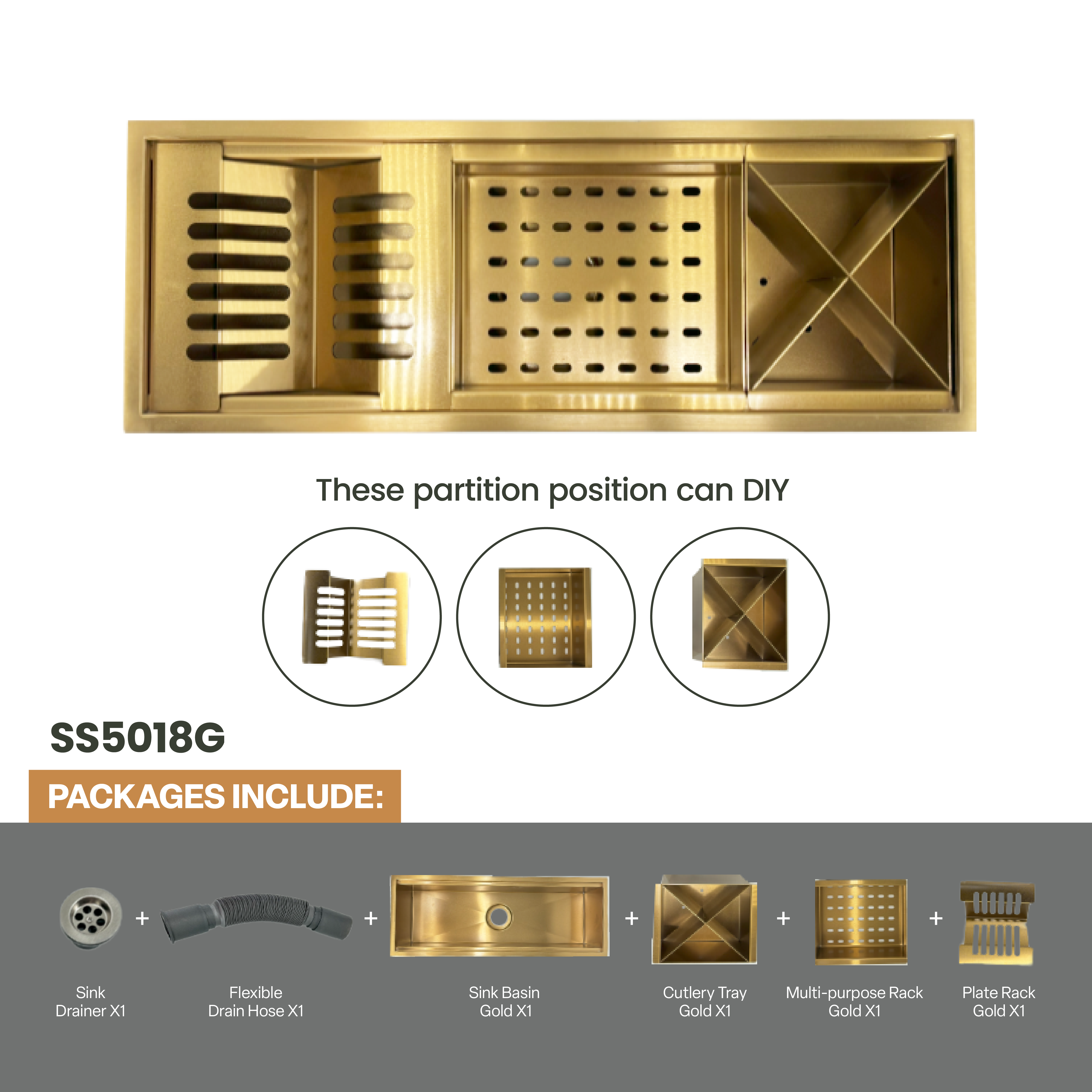 Lenght: 500mmWidth: 185mmDepth: 140mmThickness: 3mm/1.2mmMaterial: SUS 304Colour: Gold