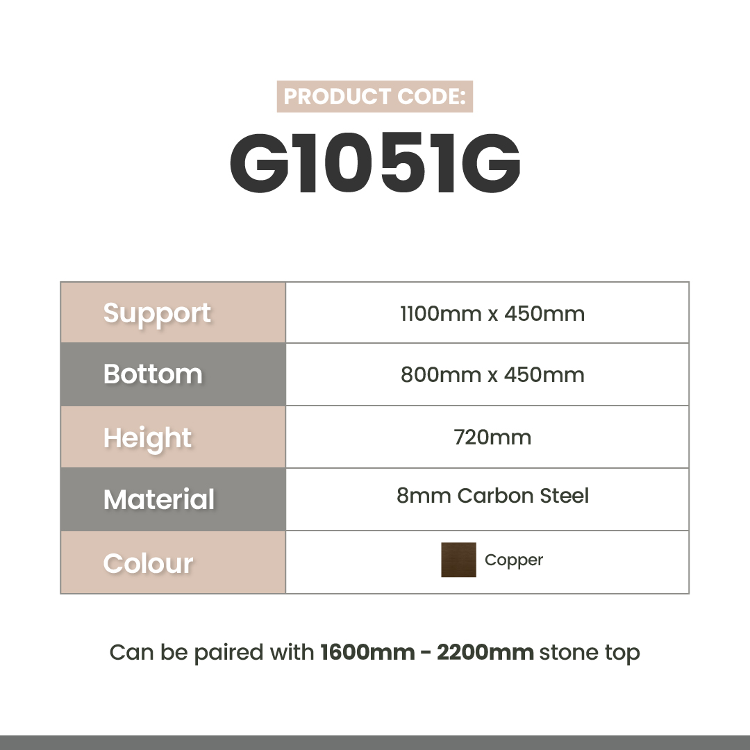 Support: 1100mm x 450mmBottom: 800mm x 450mmHeight: 720mmMaterial: 8mm Carbon SteelColour: CopperCan be paired with 1600mm-2200mm stone top